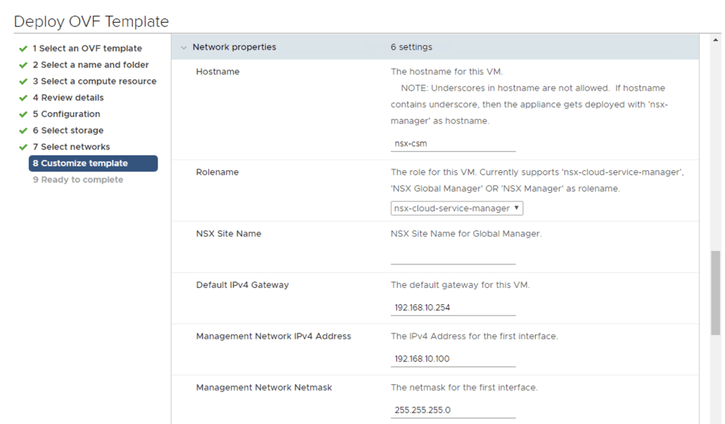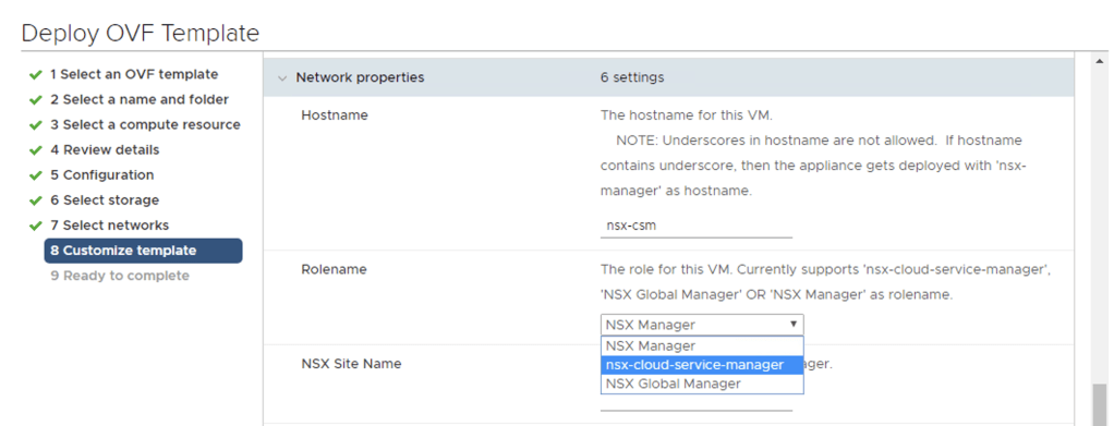Now we need to configure the hostname and an important step is to select the role for this appliance – since we are deploying this as a CSM, I select nsx-cloud-service-manager from the drop menu