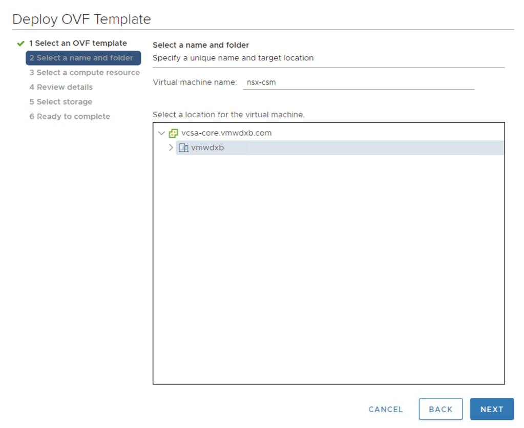 Step 2 – Provide a Virtual Machine Name for this deployment, I am just using NSX-CSM