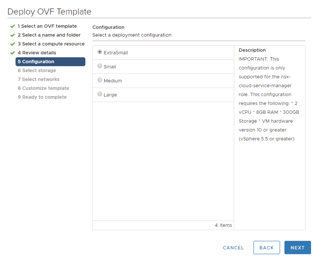Step 5 – This is now where we decide to deploy this as a traditional NSX-T Manager or CSM. By Selecting ExtraSmall you will see the side note that this configuration is only supported for the NSX-T Cloud-Services-Manager and the resources required for this deployment. If you accidentally go ahead with the default selection of Medium, you would need to restart from Step 1