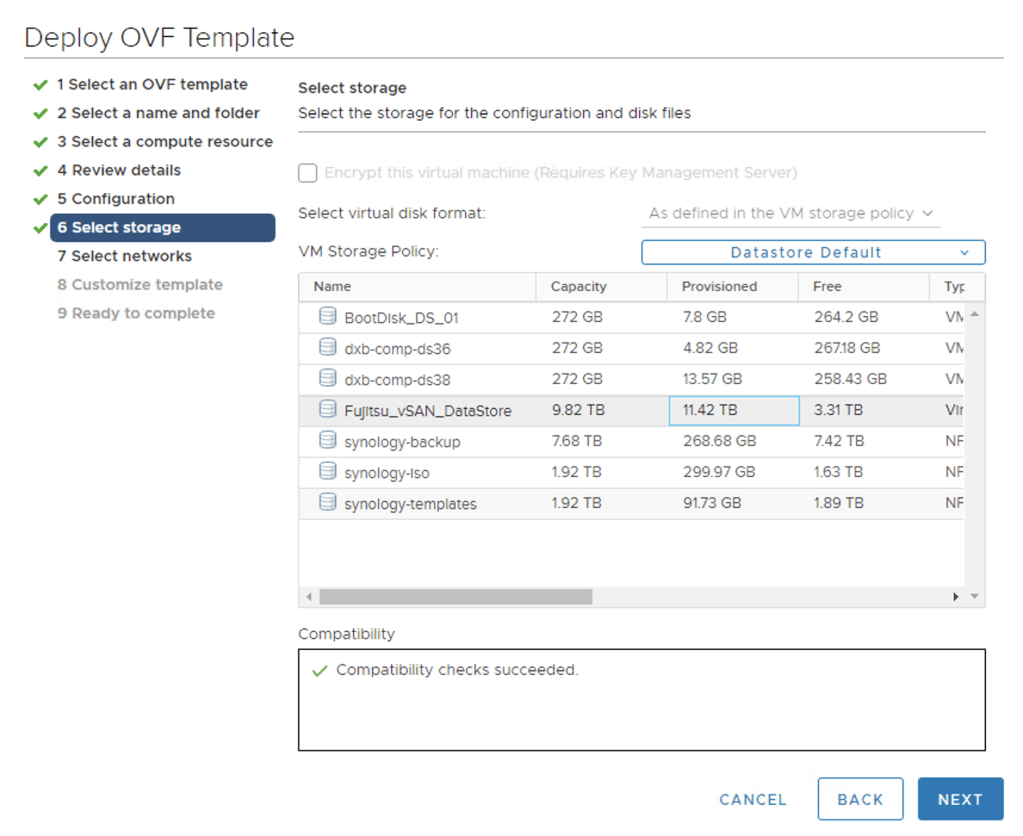 Step 6 – Next we select the storage where the appliance would be deployed too. In my case I have a vSAN datastore in my management cluster and I will deploy it there.
