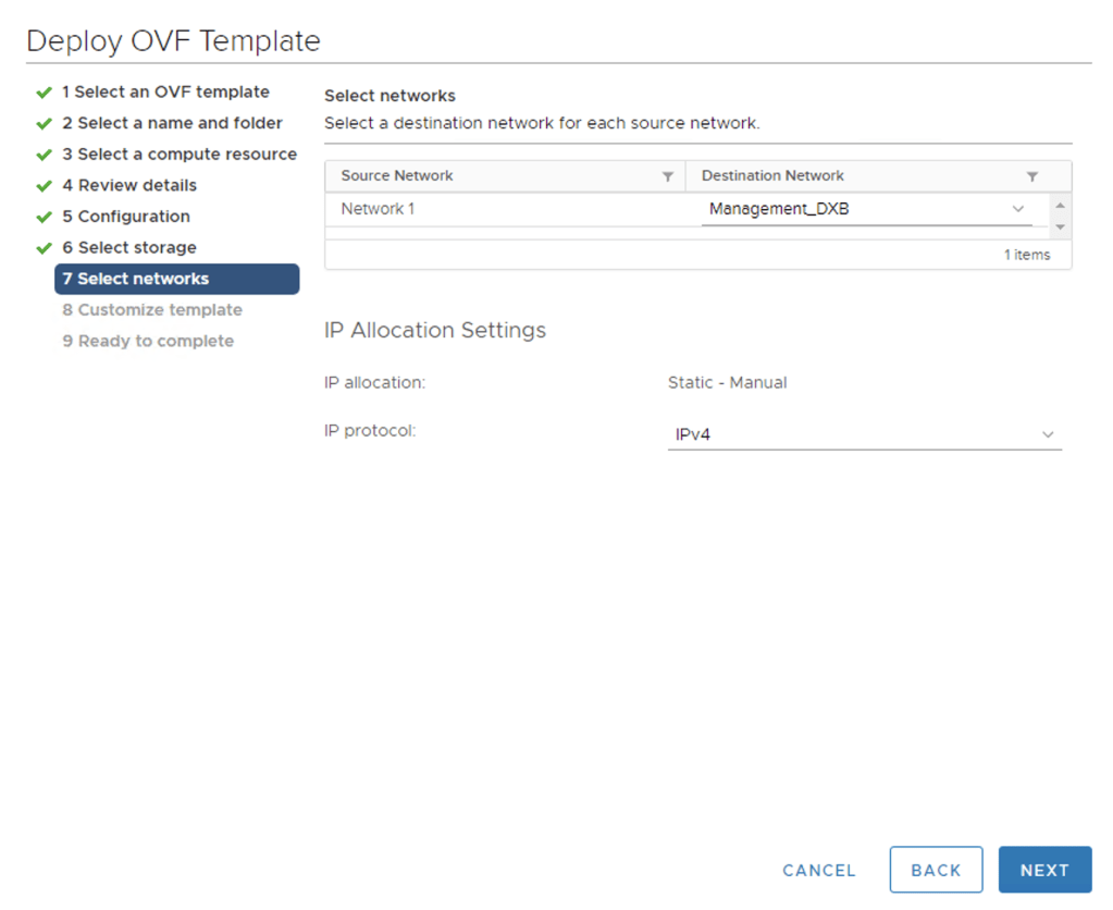 Step 7 – Select the correct portgroup to which the CSM will be attached too – in my lab I will use Management_DXB – this is the same port group where my on premise NSX-T Manager is connected too.