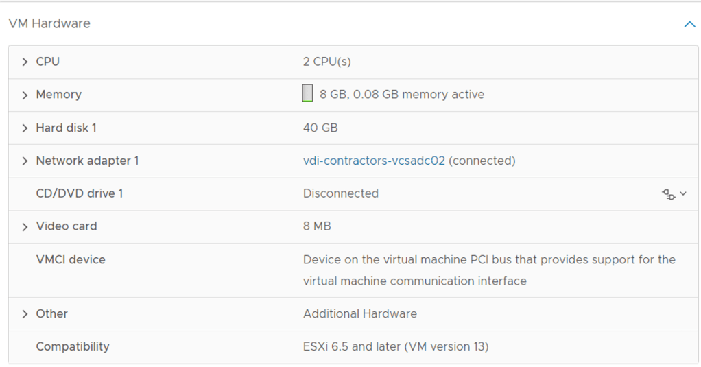 On the Summary page, expand the VM Hardware pane, and observe the Compatibility information of the VM. The VM version number must be 9 or later.