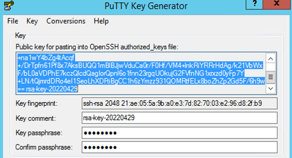 Once PuTTYgen opens it asks you to key moving your mouse cursor around in the box so that it does the random generation and once completed you will see the following output
