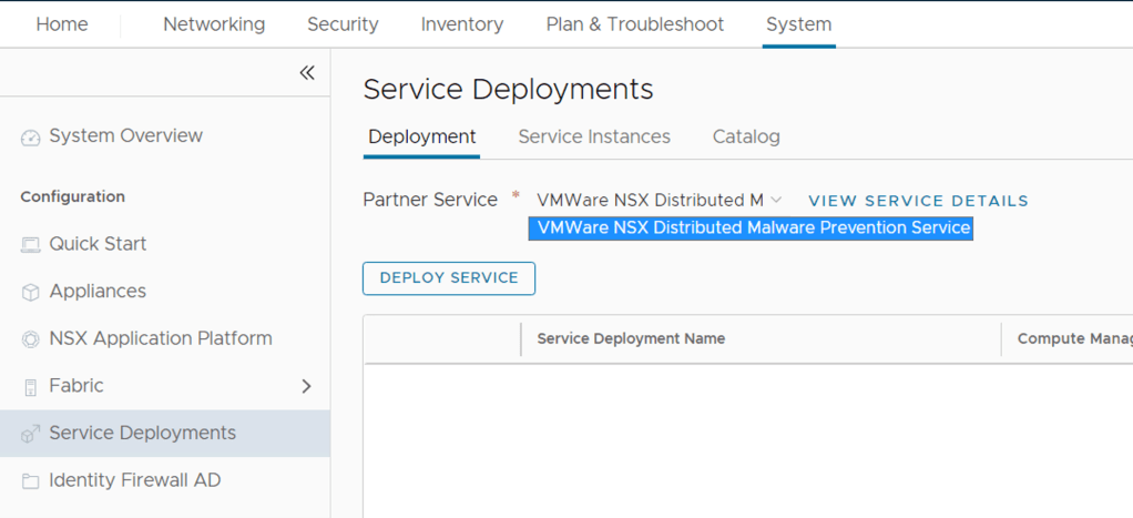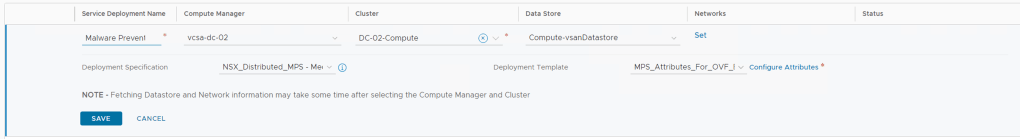 Now we are going to create a service which would be deploying the Service VM’s on our selected vCenter Cluster – Select VMware NSX Distributed Malware Prevention Service, and click Deploy.