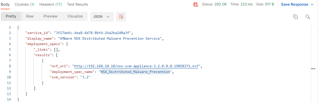 Now we are going to need test our API skills using Postman or a similar tool you prefer using to send an API to the NSX-T Manager. This API call will basically instruct the NSX Manager where it will find/download the files it needs to create the SVM which get deployed in a few steps from here.