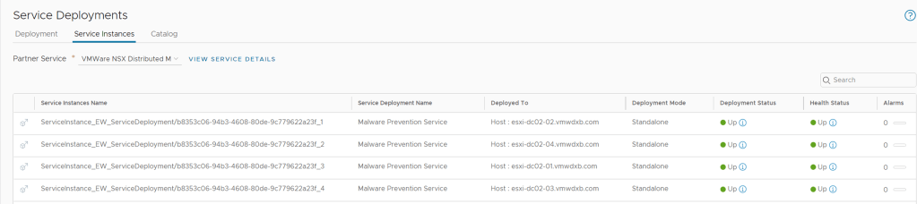 From the NSX Manager if you refresh page in the services instances, if all went well you will see your SVM’s deployment status and health status Up and the dot turn Green