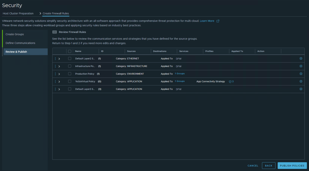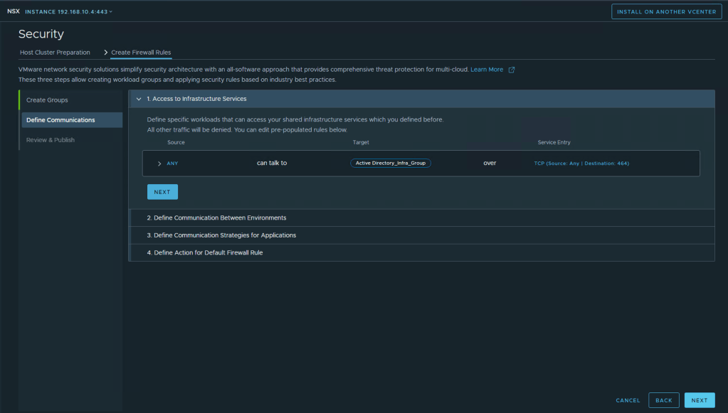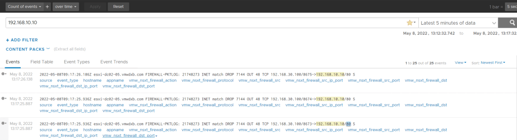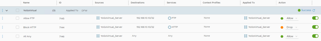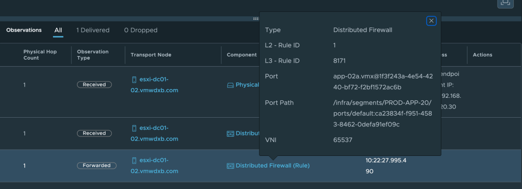 Output for traffic from App01 to App02Details when clicking on Distributed Firewall Rule