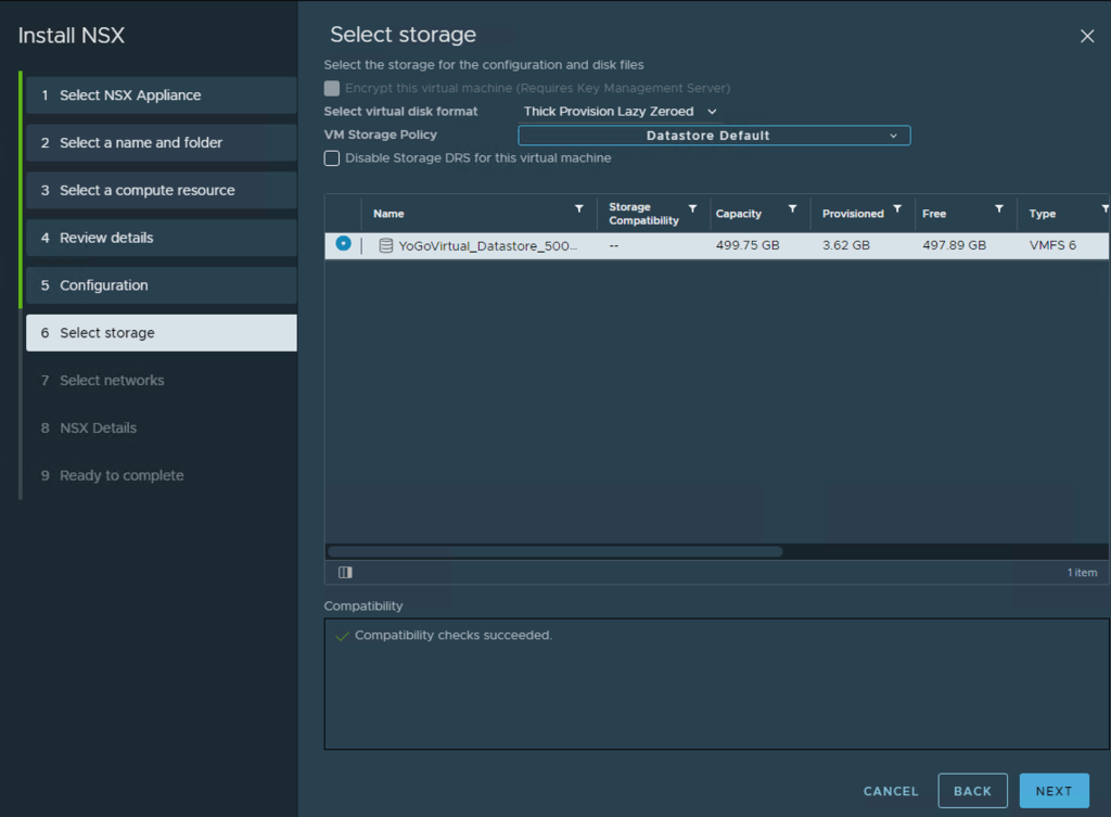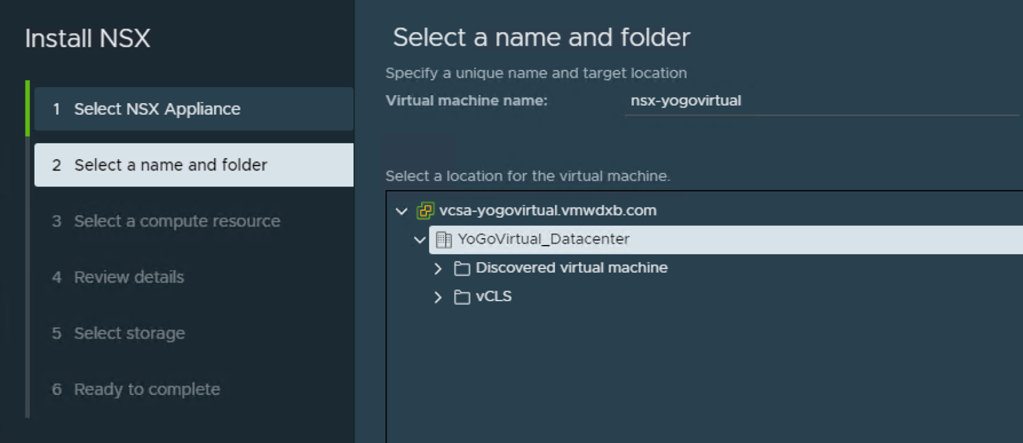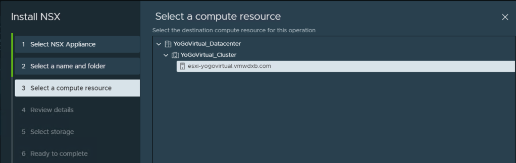 Then select the correct vCenter and vSphere cluster with the datastore for your deployment. Select the