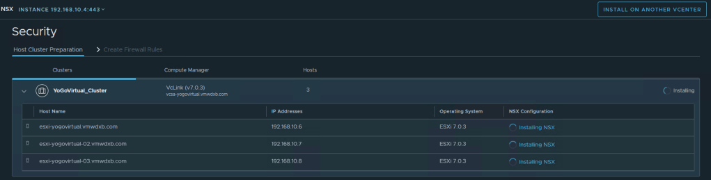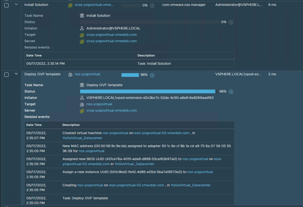 If all your parameters entered are correct you see the orange “progress” status. Depending on your environment and how many ESXi servers in your vCenter cluster, it could a little bit of time as each SVM is created and deployed.