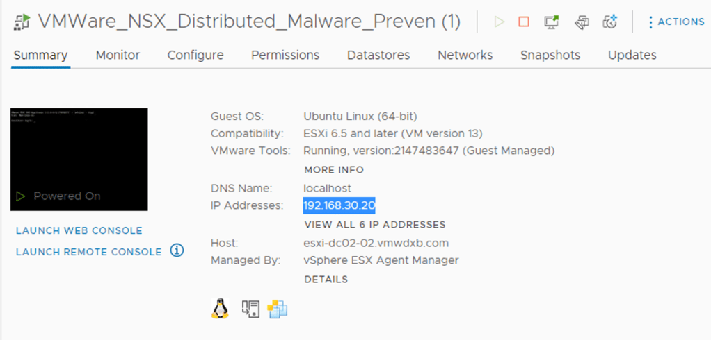 From vCenter -> Hosts & Clusters -> Expand the Cluster where you deployed the SVM’s -> ESX Agents Folder -> Click on the first SVM (VMWare_NSX_Distributed_Malware_Preven (1)