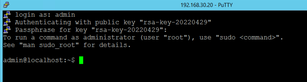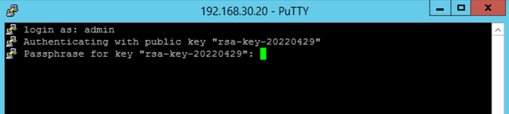 If your key upload was successful, you can enter the username admin and you will be asked for the Passphrase you used when you created the private/public key