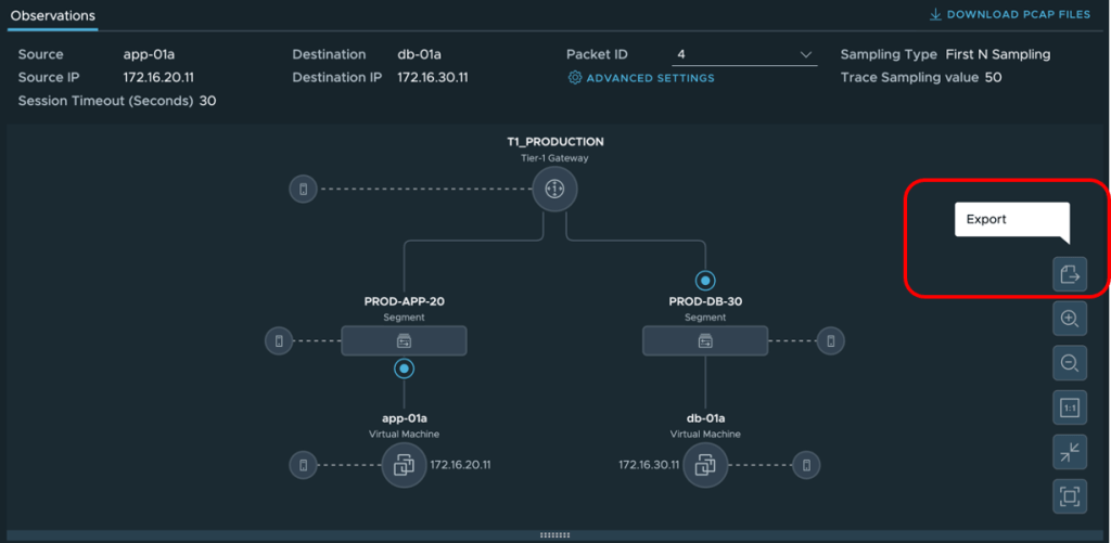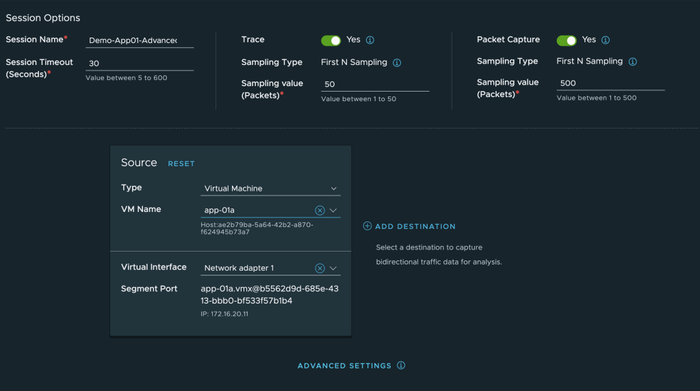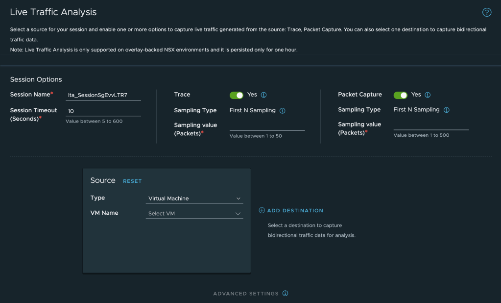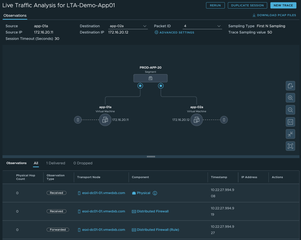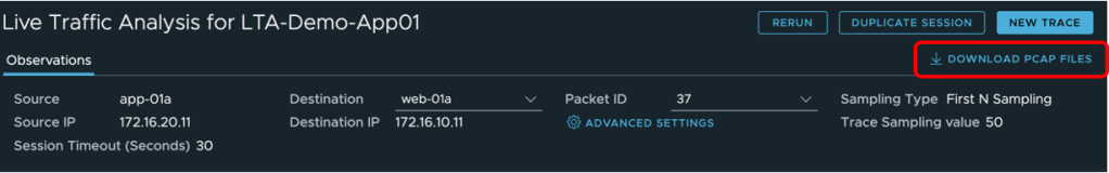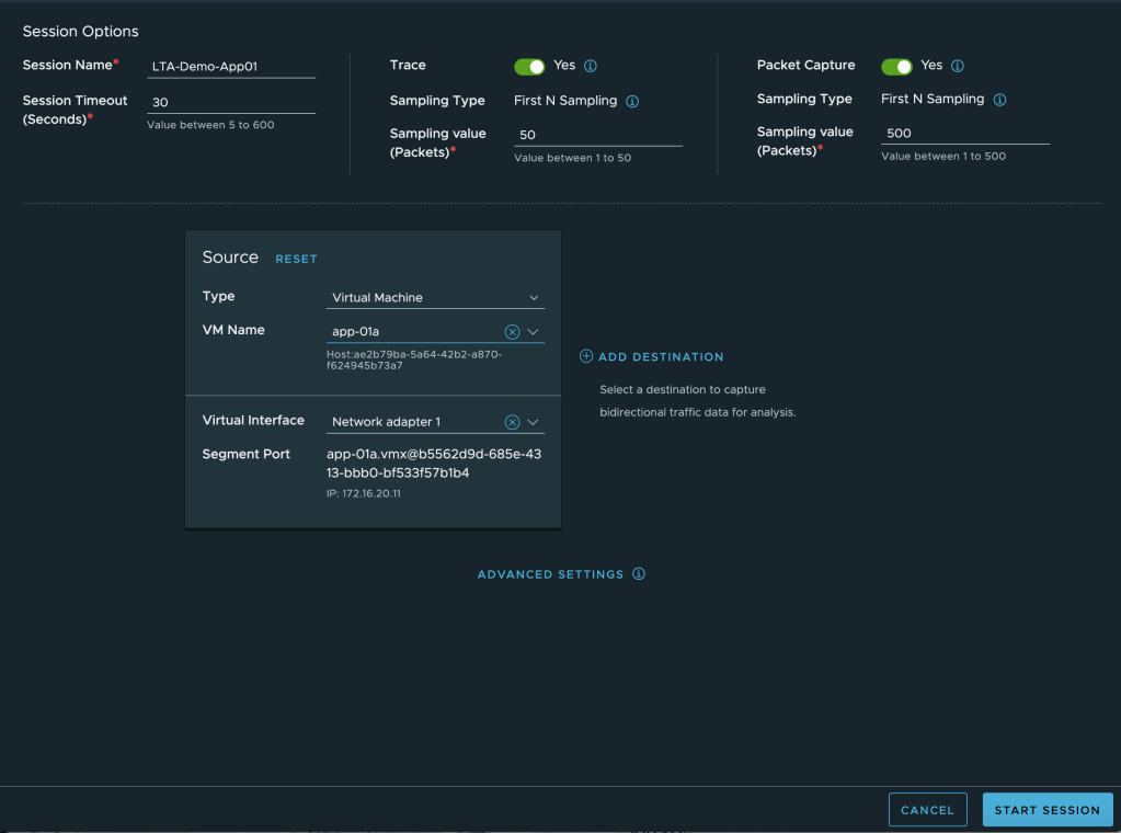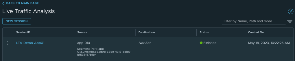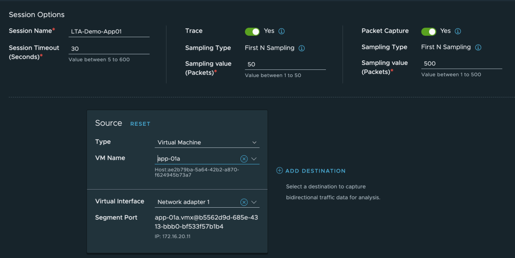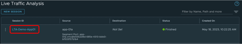 NSX LTA allows you to create a session to monitor the Live Traffic for one or two VM’s. So you can create a session that only has one workload which you want to monitor or you can select two workloads and monitor the traffic between these two workloads.