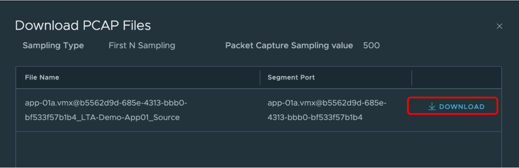 Now on the window that opens select Download – select the destination on your local machine where to download and save the PCAP file too.