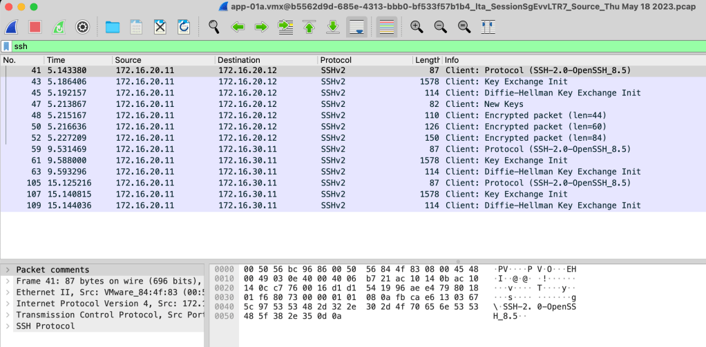 Here we can see the SSH connection from 172.16.20.11 to 172.16.20.12 and 172.16.30.11