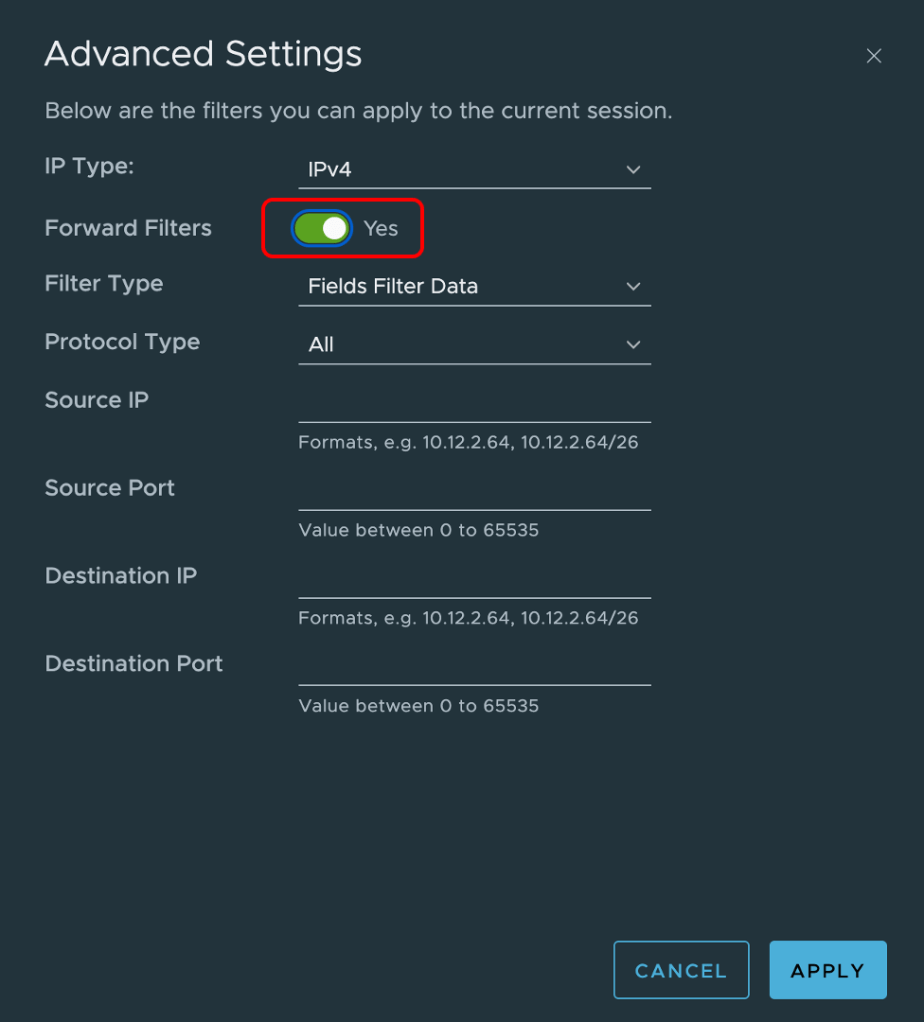 Trace (Yes) = By default, the toggle is active. Trace generates the packet traceflow. If you select only the source, system generates the traceflow for the packets ingressed from the source (matching the forward filter, if any). If you also select the destination, in addition system generates the traceflow for the packets ingressed from the destination (matching the reverse filter, if any).
