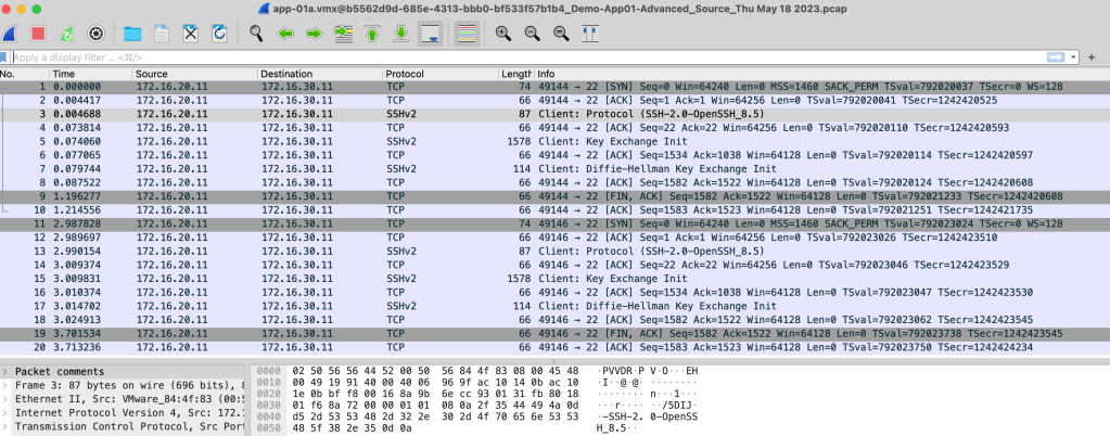 I am planning to run the monitor session for 30 seconds. I am going to monitor the traffic sourced from my App01 (172.16.20.11) to some other VM’s in my environment. I will do an ssh connection from App01 to App02 (172.16.20.12), DB01 (172.16.30.11) and Web01 (172.16.10.11). ***Take Note, my distribute Firewall is currently allowing all communication between these VMs.
